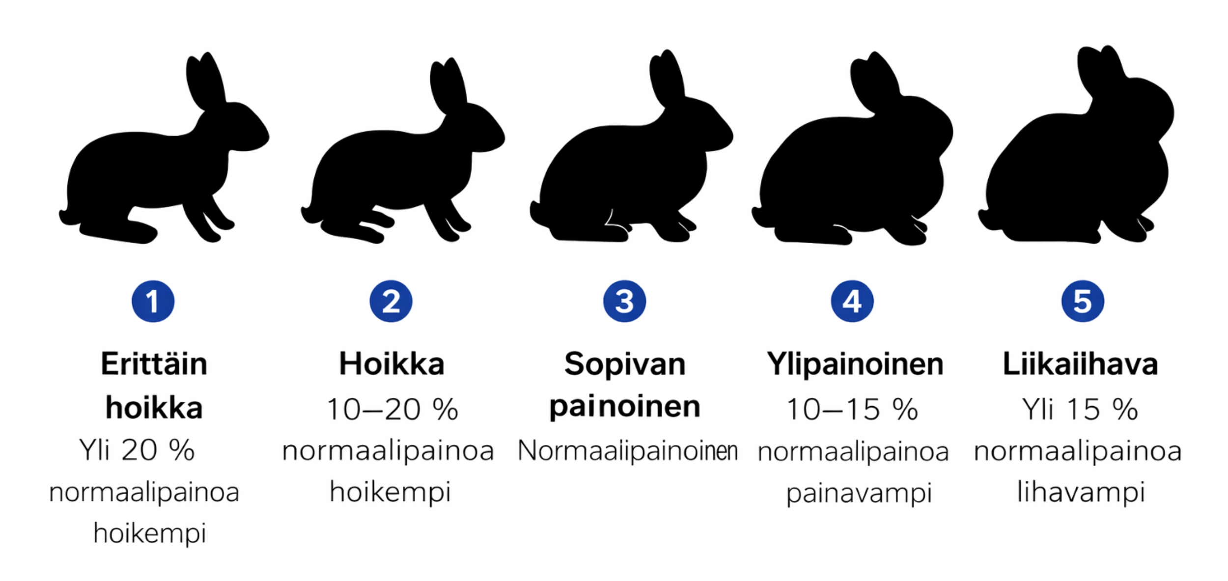 Kanin ylipaino on valitettavan yleinen ongelma, ja samalla yksi aliarvioiduimmista. Pyöreä olemus saatetaan tulkita “söpöydeksi”, vaikka todellisuudessa ylimääräinen rasva kuormittaa kanin kehoa monin tavoin ja altistaa vakaville sairauksille. Kanin ihannekunto ei perustu pelkkään vaa’an lukemaan, vaan kehon kuntoluokitukseen (BCS, Body Condition Score), jossa arvioidaan muun muassa kylkiluiden, selkärangan ja lantion tuntuvuutta.