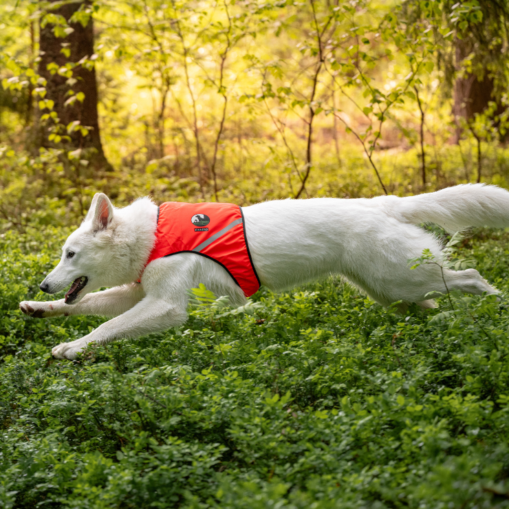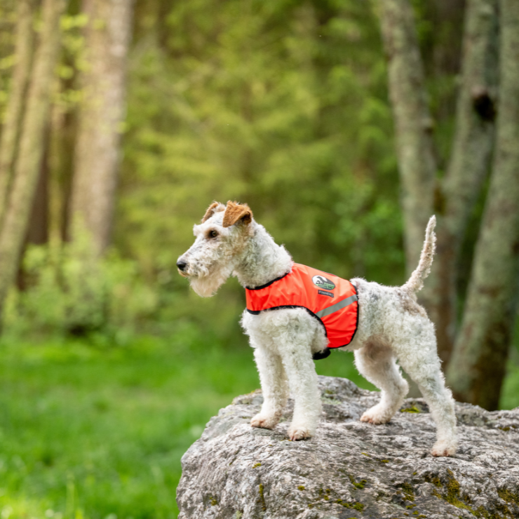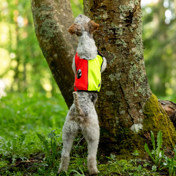 Kaksivärinen design helpottaa koiran sijainnin hahmottamista metsästyksessä, ja hämärässä liivin pinta heijastaa valoa tehokkaasti. UV-säteilyn kesto varmistaa kirkkaiden värien säilymisen.